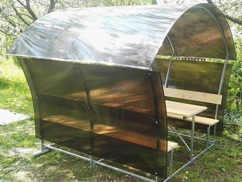 Верх покрывается сотовым поликарбонатом. Цвет на выбор: прозрачный, бронзовый, гранат, желтый, зеленый, красный, белый, бирюза, серый, синий.