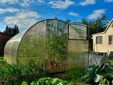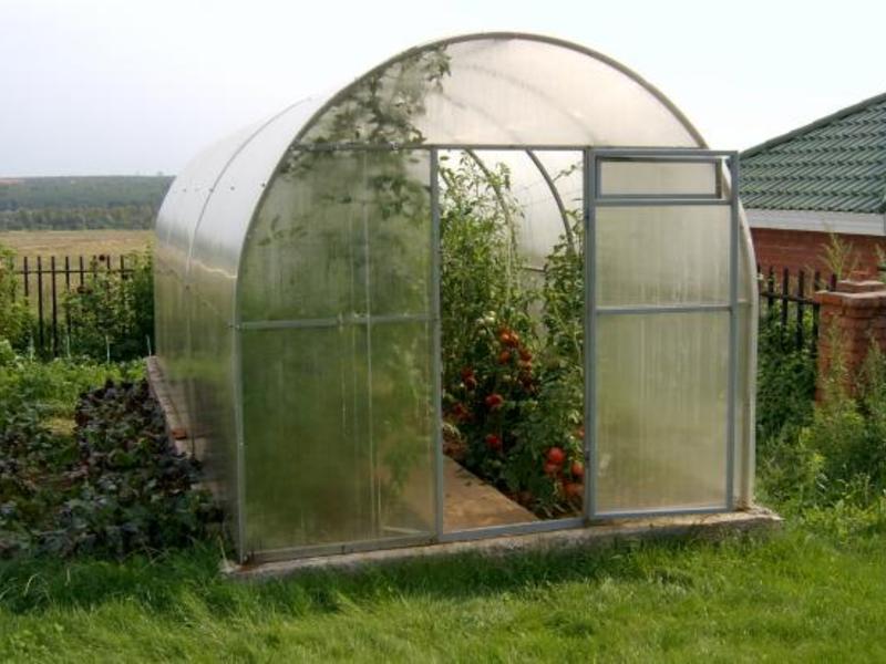 Арочный каркас теплицы изготовлен из профильной трубы квадратного сечения 40×20 мм. С торцов теплицы установлены двери и форточки, фиксирующиеся в открытом и закрытом положении. Усиленные арки соединены девятью прогонами.