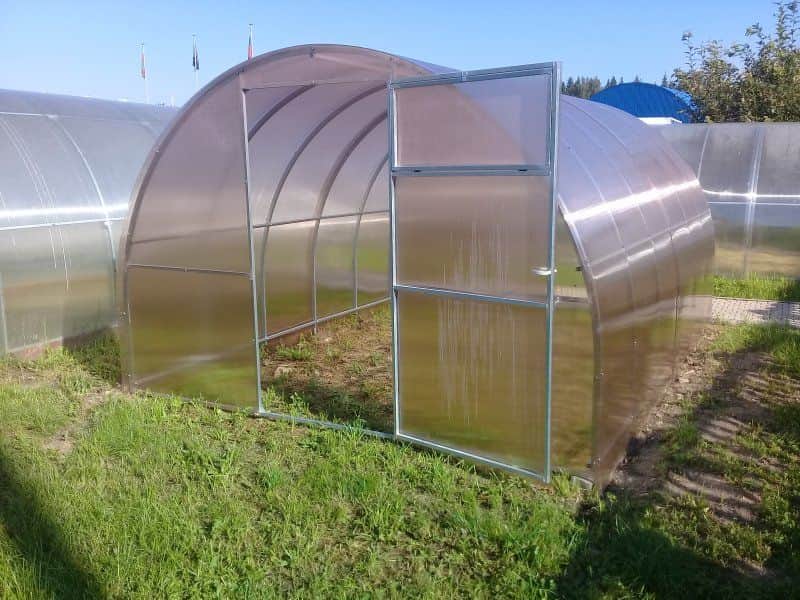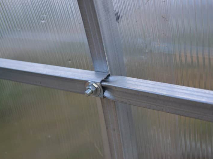 Арочный каркас теплицы изготовлен из профильной трубы квадратного сечения 20×20 мм. С торцов теплицы установлены двери и форточки, фиксирующиеся в открытом и закрытом положении. Усиленные арки соединены девятью прогонами.
